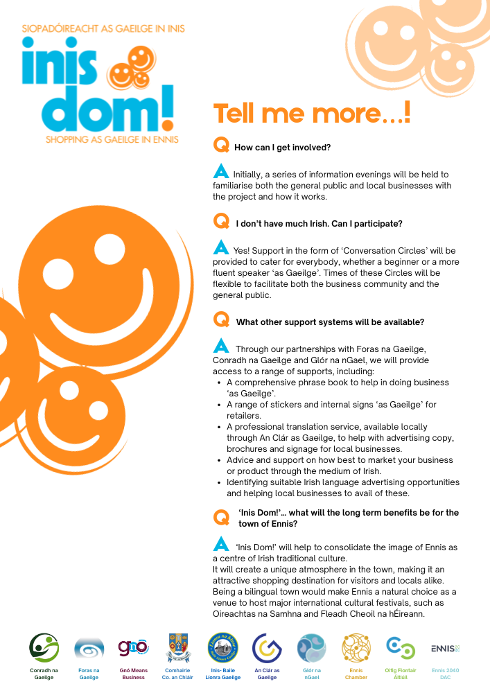 Ruairí Henchy, Irish Language Development Officer/Communications Officer, Clare County Council, said, “The campaign’s motto is: ‘Frásaí Beaga, Tionchar Mór – Small Phrases, Big Impact’, and aims to take Irish off the pages of books and into the streets and businesses of Ennis and beyond. Shoppers are encouraged to start with: “Dia duit – Hello” and to watch out for the Inis Dom! badge and sticker when shopping in Ennis.”